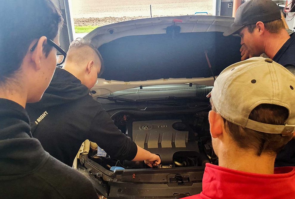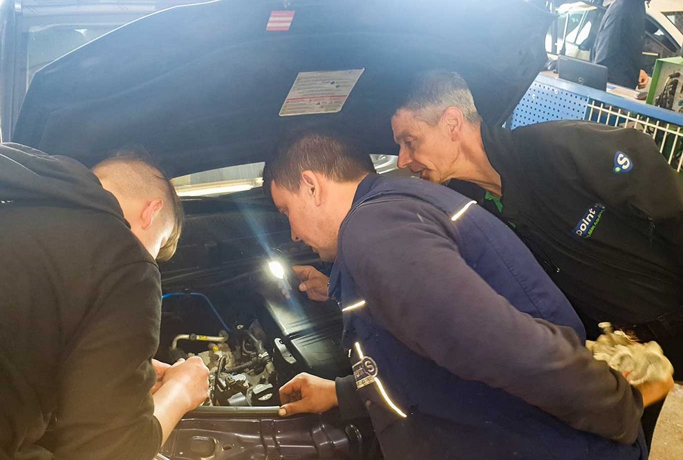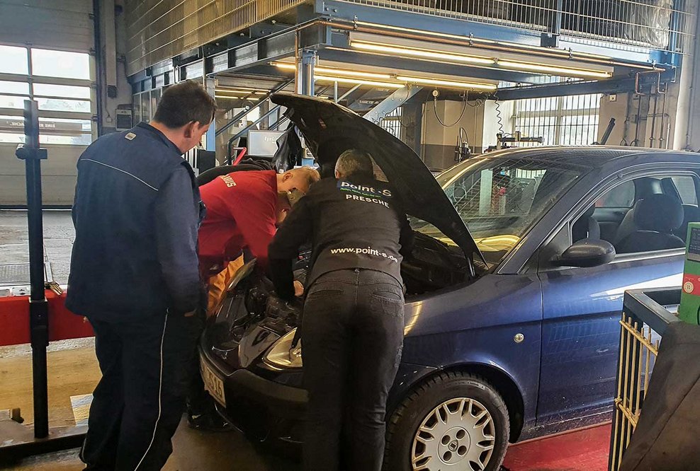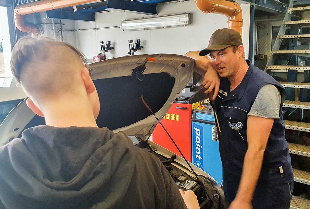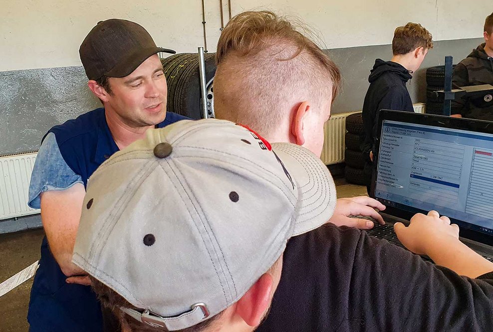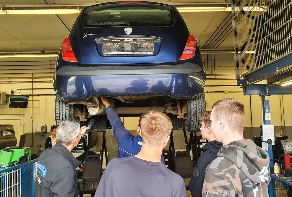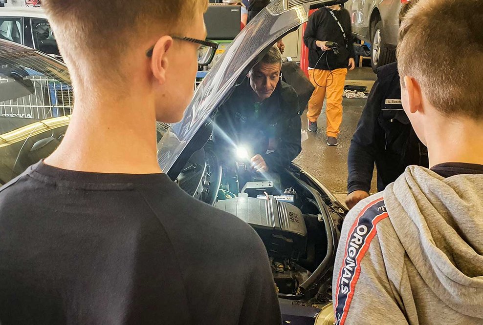 Im Anschluss der Kurzvorstellung ging es in die Werkstatt und die Jungs konnten selbst Hand anlegen. Als erstes sollten sie einen Winter-Check bei einem PKW durchführen. Vom Licht- über den Öl- bis hin zum Reifencheck konnten die 14- und 15-Jährigen viel Wissenswertes von den Mechatronikern erfahren. Zwei der angestellten Facharbeiter waren selbst einmal Schüler der Siegfried-Marcus-Schule und kamen durch ein Praktikum bei Reifen Presche zu ihrer Ausbildung als Mechaniker für Reifen- und Vulkanisationstechnik und KFZ-Mechatroniker.