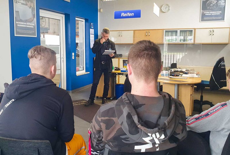 Bert Presche stellte sich und sein 30-jähriges Familienunternehmen erst einmal den Schülern vor. Von Anfang an lag der Schwerpunkt dabei auf Reifen. 2001 kam der KFZ-Service dazu, der erst einmal neben einem hohen Investment auch weitere Mitarbeiter erforderte. Damit einhergehend kam der Fachkräftebedarf und der Bereich Ausbildung dazu. Die Jungs interessierten sich neben der Dauer der Ausbildung zum KFZ-Mechatroniker vor allem für den Standort der Berufsschule, der mit Demmin ganz praktisch liegt. Auch die Ausbildungsvergütung der dreieinhalbjährigen Ausbildung war von Interesse.