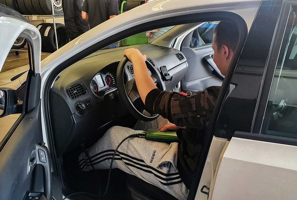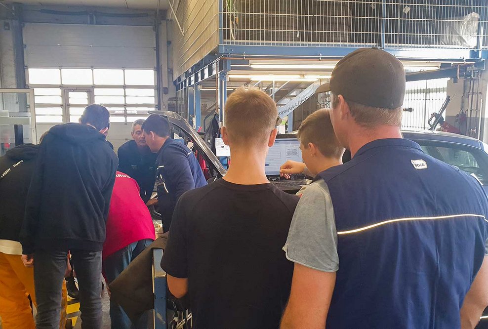 Danach ging es an eine Abgasuntersuchung, die den Jungs ebenfalls viel Spaß bereitete. So konnte Jannek sich selbst einmal ans Steuer setzen, den Wagen alleine starten und richtig Gas geben – natürlich im Leerlauf und mit gezogener Handbremse. Die Jungs staunten nicht schlecht, dass diese Messungen alle über Laptops liefen, die sie so gar nicht in einer Werkstatt vermuteten.
