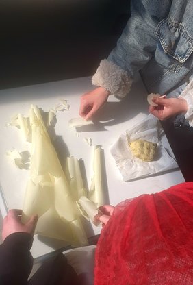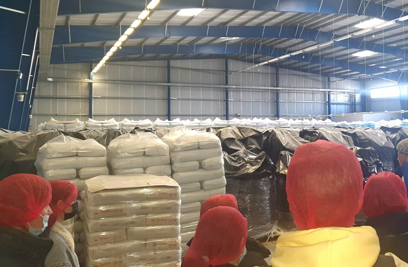 Nach dem die Kartoffeln sich dem Dampfschälverfahren unterzogen haben, kam der spannendste Teil des Herstellungsprozesses – die Trocknung. Die Jungen und Mädchen staunten nicht schlecht, als am Ende des Trocknungsvorgangs statt Kartoffelflocken scheinbar hauchdünnes Pergamentpapier aus der Maschine kam, welches beim Anfassen in klitzekleine Teile zerfiel. Dieses Ergebnis war dem Walzentrockner zu verdanken, erläuterte Herr Lücke. So sehen die Kartoffelflocken mit unterschiedlichen Feinanteilen dann kurz vor der Abfüllung aus. Hauptsächlich werden Kartoffelpüree und Kartoffelknödeln mit unterschiedlichen Rezepturen und in vielfältigen Größen abgepackt, vom Instant-Becher bis hin zu Großpackungen für Kantinen.