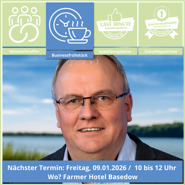 wir freuen uns sehr, Sie zu unserem ersten Unternehmerfrühstück im neuen Jahr einzuladen – am Freitag, den 09. Januar 2026, von 10:00 bis 12:00 Uhr im gemütlichen Farmerhotel Basedow.