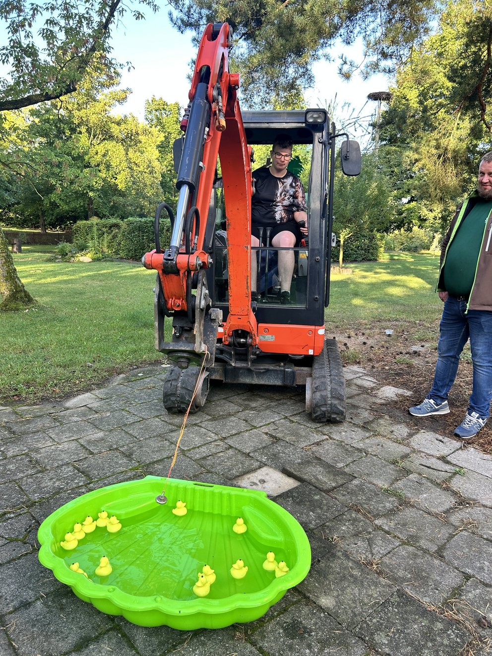 Ein besonderes Highlight bot der Garten- und Landschaftsbaubetrieb Dädelow. Mit schwerem Gerät, genauer gesagt mit einem Bagger, konnten die Jugendlichen u.a. Enten „angeln“ – spielerisch, aber mit einem realistischen Blick auf die Präzision, die im GaLaBau täglich gefordert ist.