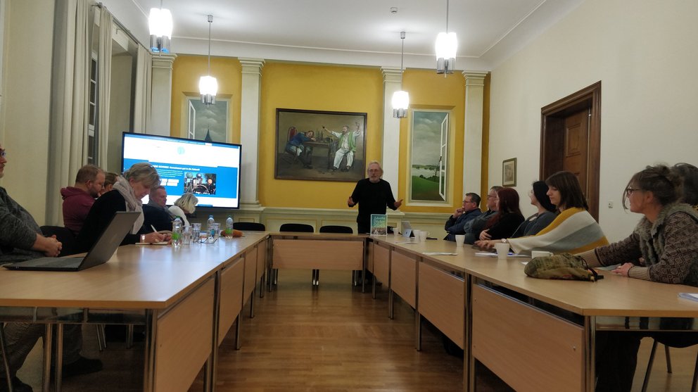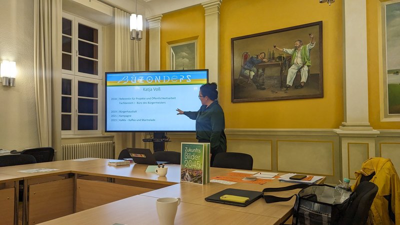 Am Abend darauf traf sich die Runde zum Thema „Gemeinsam die Stadt beleben“ und erhielten passende Impulse von Katja Voss Referentin für Projekte und Öffentlichkeitsarbeit der Stadt Bützow. Sie stellte Arbeitsweisen vor, die aus ihrer Erfahrung sinnvoll für erfolgreiche Stadtvorhaben sind und betonte die besonderen Fähigkeiten der kommunalen Verwaltung und des Bürgermeisters als wichtigen Projektpartner. Eine gute Methode, um Bürgerbedarfe zu erfahren ist ein jährliches Bürgerbudget, welches in der Stadt Bützow vergeben wird. So haben die Bützower Einwohner über eine Abstimmung direkten Einfluss darauf welche Maßnahmen und Projekte mit einem Teil Haushalts der Stadt umgesetzt werden. Am Beispiel des KA-MA, ein Laden für regionale Vermarktung und Treffpunkt zeigte Katja Voss auf, dass Projekte dann sinnvoll sind, wenn sie zur Stärkung der Identität beitragen und einen sozialen Mehrwert haben.