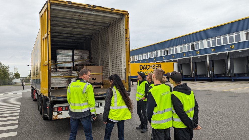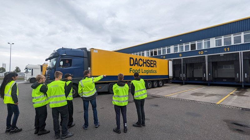 Beim Unternehmen DACHSER SE, einem der europaweit führenden Logistikdienstleister, konnten die Schüler ebenfalls hinter die Kulissen des beindruckenden Firmensitzes in Stavenhagen blicken. Sie erfuhren, dass hinter der Logistik nicht nur die allen bekannten blau-gelben LKWs auf den Straßen stecken, sondern auch zahlreiche Mitarbeiter, die beispielsweise in den Büros die Koordination der einzelnen Aufträge übernehmen. Dementsprechend groß ist auch die Vielfalt der möglichen Ausbildungsberufe: neben dem Berufskraftfahrer, dem Fachlagerist und der Fachkraft für Lagerlogistik werden in Stavenhagen auch drei kaufmännische Berufe ausgebildet in den Bereichen Büromanagement, Spedition und Logistikdienstleistung sowie Digitalisierungsmanagement. Während des Rundgangs im Außenbereich, fuhr genau zum richtigen Zeitpunkt ein beladener LKW auf das Firmengelände und die Jugendlichen konnten aus nächster Nähe zuschauen, wie der LKW an die Laderampe andockt, den Anhänger sichert und das Fahrerhaus abkoppelt. Auszubildender Liam schilderte den Schülern aus erster Hand, was ihn dazu bewogen hatte sich bei DACHSER zu bewerben und dass er nun glücklich ist seit diesem September den Beruf des Berufskraftfahrers erlernen zu können.