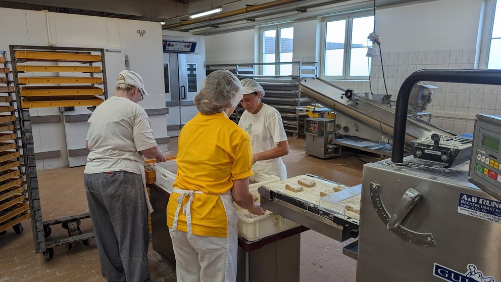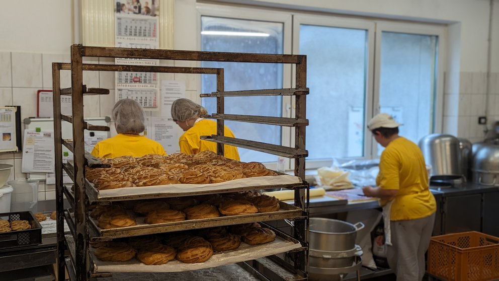 Bei der Bäckerei und Konditorei Hatscher konnten drei Mädchen direkt in die Produktion des Traditionsbetriebes schnuppern und so Einblicke in den Beruf der Bäckerin und der Konditorin erlangen. Da die Bäckerei seit zwei Jahren auf ein neues Schichtmodell umgestellt hat, bei der nicht nur nachts, sondern auch am Tag produziert wird, war es möglich, dass die Schülerinnen die Produktion miterleben konnten. Eingekleidet mit gelben Firmenshirts und somit kaum zu unterschieden von den übrigen Mitarbeitern, durften die Schülerinnen selbst mit anpacken. So wurden Brötchenteiglinge in Sonnenblumenkerne getaucht, Windbeutel aufgeschnitten und für die Weiterproduktion vorbereitet sowie Teig für Cakepops abgewogen und zu Kugeln geformt. Als Erinnerung an diese Erfahrung konnten die Mädchen zum Anschluss noch selbstgeflochtene Hefezöpfe mit nach Hause nehmen.