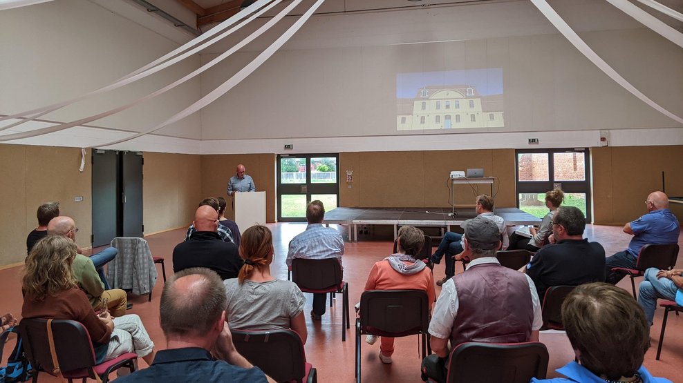 Rund 30 Gäste, darunter interessierte Bürgerinnen & Bürger der Gemeinde und der Umgebung sowie Unternehmer:innen und potenzielle Partner:innen, kamen an diesem Abend in der Traditionshalle in Ivenack zusammen. Bürgermeister Roy Lüth begrüßte die Runde und führte durch die Veranstaltung. Die Vorstellung und die Vision des Speicherprojekts in der Gemeinde Ivenack stand an diesem Abend ganz klar an erster Stelle. „Das große Ziel ist es, den historischen Speicher der ehemaligen Gutsanlage in Ivenack wieder mit Leben und nachhaltigen Unternehmungen zu füllen. Jetzt geht es um die Umsetzung der Sanierung und vor allem Unternehmen zu gewinnen, die sich vorstellen können sich mit Gastronomie, Unterbringung, Handwerk und Erholung in diesem Objekt anzusiedeln.“ erklärte Roy Lüth. In Zusammenarbeit mit dem Regionalen Unternehmensnetzwerk wurde in den vergangenen Monaten bereits ein erstes Nutzungskonzept für das Speichergebäude erstellt, welches auf drei Etagen eine Fläche von 4000m² umfasst. Hierfür befasste man sich intensiv mit der Frage, welche Möglichkeiten die Gäste der Region noch benötigen, insbesondere in Hinblick auf die Besucher der Ivenacker Eichen. Das Ausflugsziel, das bei Familien sehr beliebt ist, lockt jährlich bis zu 120.000 Tagestouristen in die kleine Gemeinde – ein Potenzial, dass man für das Speichervorhaben nutzen möchte. Denn hier können neben Übernachtungsmöglichkeiten auch weitere Freizeitangebote entstehen, die nicht nur den Besuchern der Ivenacker Eichen, sondern auch den Einheimischen und den Gästen der gesamten Region einen Mehrwert bieten sollen. Das erste Nutzungskonzept sieht eine gastronomische Einrichtung inklusive Außenbereich, eine Kinderspielwelt, eine Schaudestillerie, eine Tourist-Information, regionale Produkte, einen Bereich für Kunst und Kunstschaffende sowie öffentlich nutzbare Besprechungsräume und sogar eine Arztpraxis vor. Lisa Ruschin vom RUN Netzwerk stelle die ersten Ansätze und Ideen vor. Der Architekt Herr Gerald Kühn von Kaehne, welcher auch den erst kürzlich renovierten Marstall in Ivenack betreut, zeigte anhand von Gebäudeplänen, wie sich die unterschiedlichen Bereiche innerhalb des Speichers einfinden könnten und erläuterte die baulichen Besonderheiten sowie die Aspekte des Denkmalschutzes. Nach den Ausführungen fanden die Gäste sich in lockeren Gesprächsrunden zusammen. Bei Getränken und Stullen mit regionalen Wilderzeugnissen, tauschte man sich zu den vorgestellten Plänen aus und schnell wurden weitere Ideen angebracht, wie man den Speicher mit Leben füllen kann. Roy Lüth: „Ich bin mit dem Verlauf des heutigen Abends sehr zufrieden und wir haben bereits erste Kontakte für weiterführende Gespräche ausgetauscht. Wir sind auf dem richtigen Weg.“