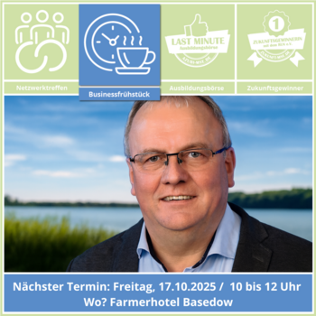 wir laden herzlich zum nächsten Unternehmerfrühstück am Freitag, den 17. Oktober 2025, von 10:00 bis 12:00 Uhr ins Farmerhotel nach Basedow ein.